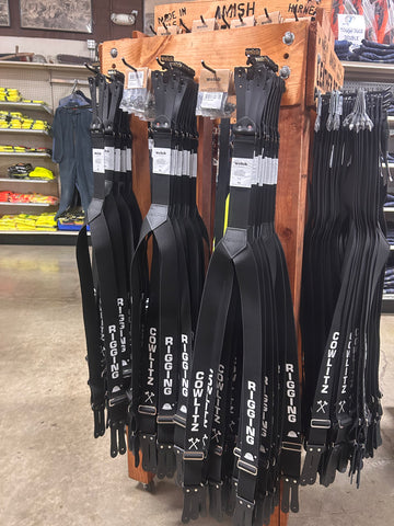 Black suspenders with white lettering. Leather ends for Bachelor buttons (Logger's buttons). They come in lengths of either 46" (Medium), 50" (Large), or 54" (X-Large).